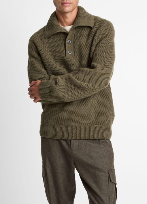 This wool sweater’s delicious texture is all thanks to the honeycomb stitch. It’s a special knitting technique that creates a warm, dense finish and distinctive dimension. Another element that elevates the coziness of our layer: a five-button mock neck. Fasten it to the top on extra chilly days.