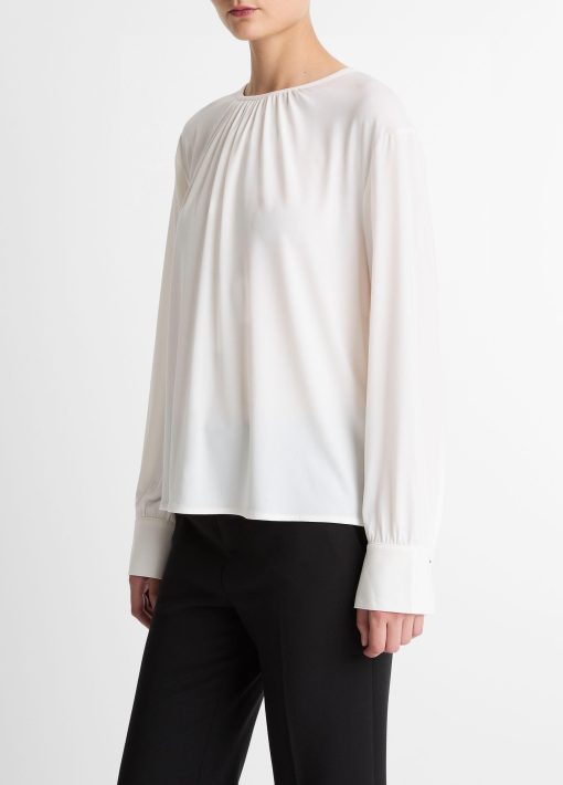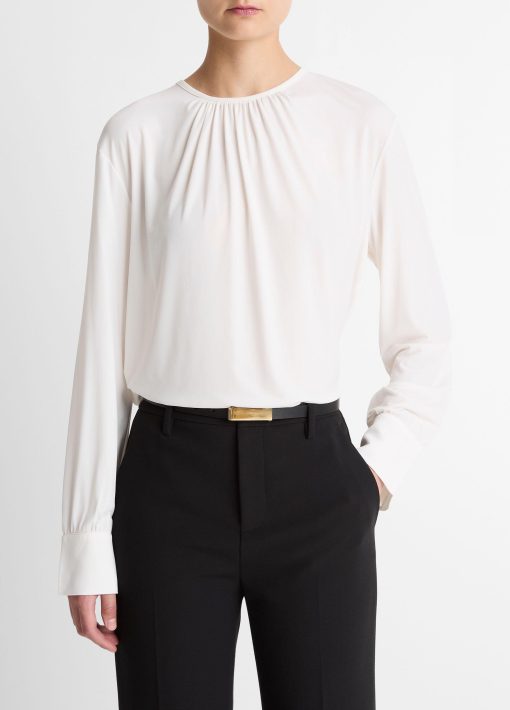 Fluid matte jersey lends this top a dressier appeal, instantly elevating trousers and denim alike. Endlessly versatile, it’s distinguished by soft gathering at the collar.