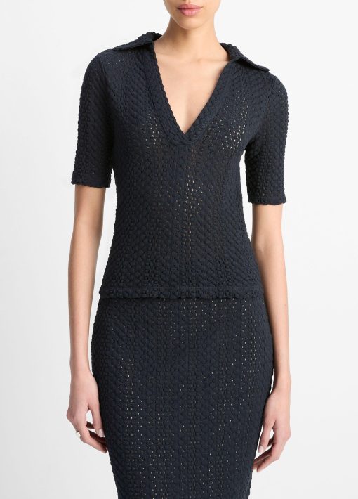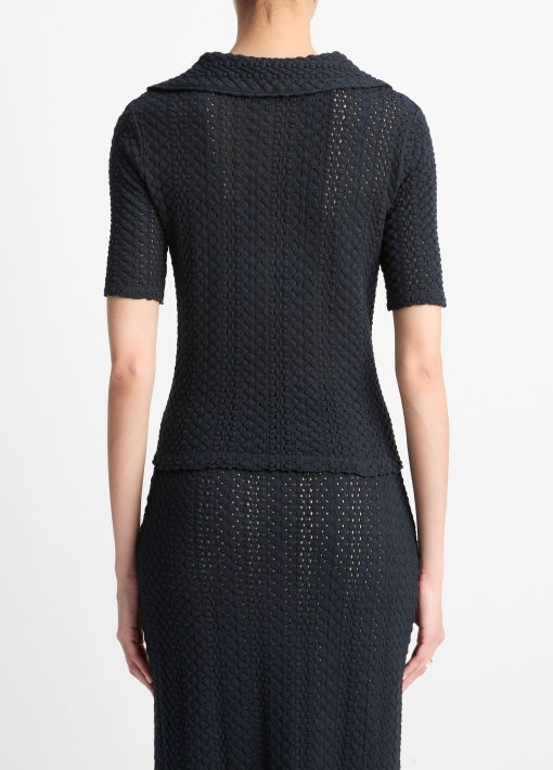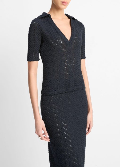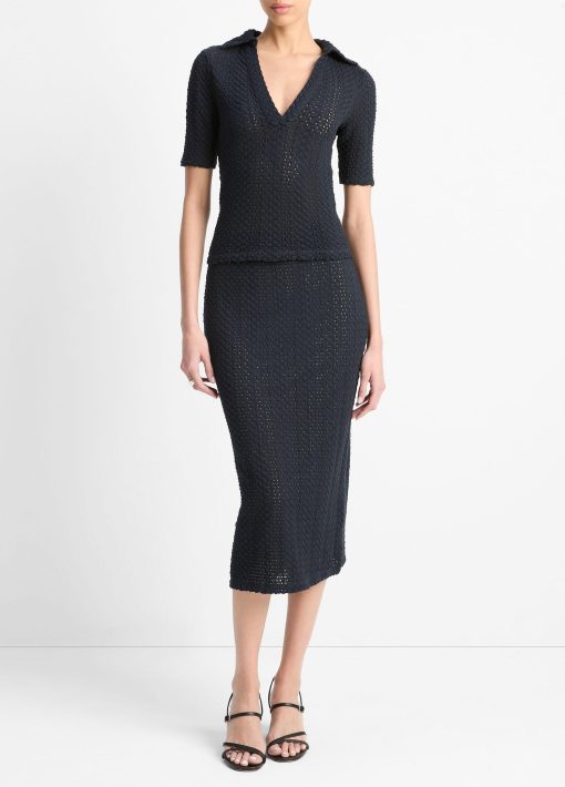 Our elbow-sleeve polo top is knit from sumptuous Japanese cotton in a crochet-inspired construction — it’s light, airy and boasts the softness of a sweater. Pair it back to our Textural Cotton Midi Skirt for a matching set.