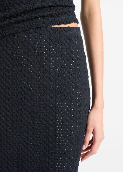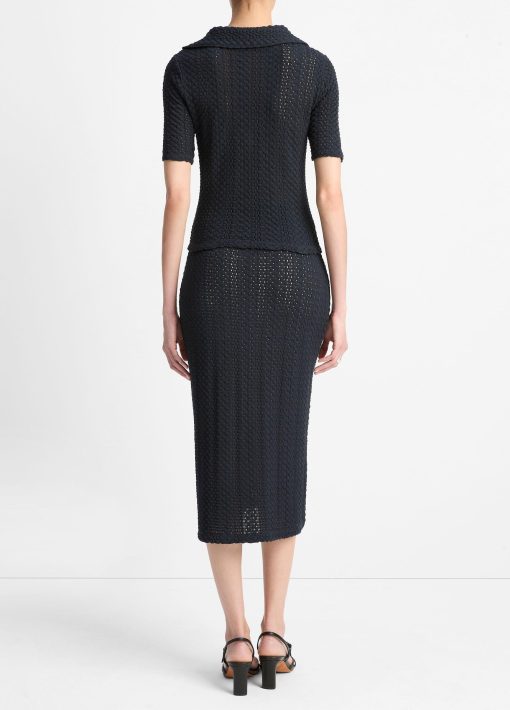 Our easy midi skirt is knit from sumptuous Japanese cotton in a crochet-inspired construction — it’s light, airy and boasts the softness of a sweater. Pair it back to our Textural Cotton Elbow-Sleeeve Polo Top for a matching set.